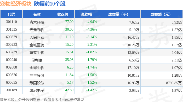 从资金流向上来看,当日宠物经济板块主力资金净流出2.44亿元,游资资金净流出8121.89万元,散户资金净流入3.25亿元。宠物经济板块个股资金流向见下表: