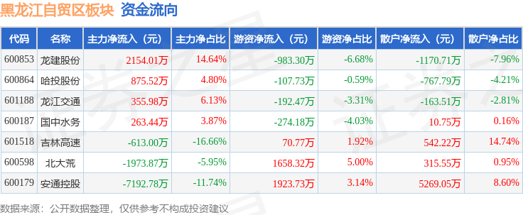 从资金流向上来看,当日黑龙江自贸区板块主力资金净流出6130.7万元,游资资金净流入2095.15万元,散户资金净流入4035.56万元。黑龙江自贸区板块个股资金流向见下表: