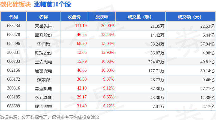 证券之星消息,1月16日碳化硅板块较上一交易日上涨4.29%,天岳先进领涨。当日上证指数报收于4101.91,下跌0.26%。深证成指报收于14281.08,下跌0.18%。碳化硅板块个股涨跌见下表: