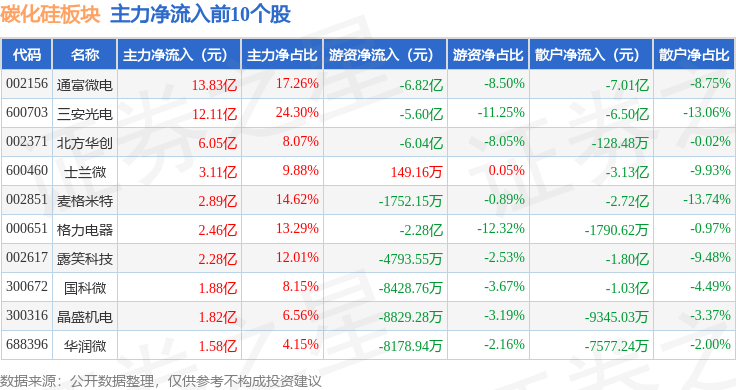 从资金流向上来看,当日碳化硅板块主力资金净流入65.3亿元,游资资金净流出24.28亿元,散户资金净流出41.03亿元。碳化硅板块个股资金流向见下表: