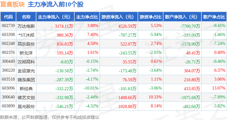 从资金流向上来看,当日盲盒板块主力资金净流出12.05亿元,游资资金净流入4.06亿元,散户资金净流入7.99亿元。盲盒板块个股资金流向见下表: