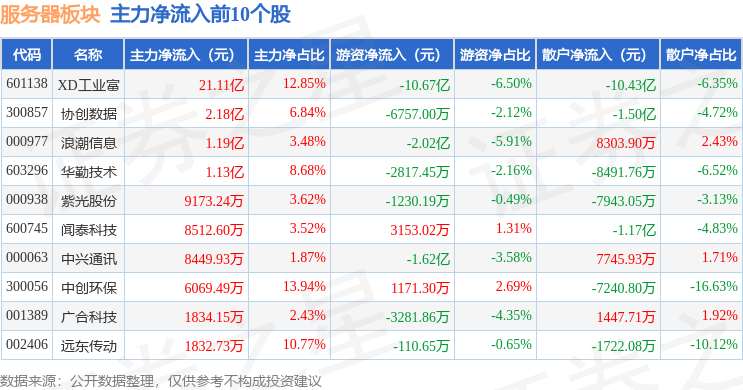 从资金流向上来看,当日服务器板块主力资金净流出4.93亿元,游资资金净流出10.47亿元,散户资金净流入15.4亿元。服务器板块个股资金流向见下表:
