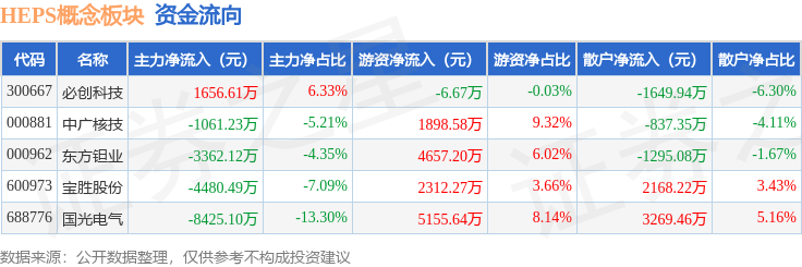 从资金流向上来看,当日HEPS概念板块主力资金净流出1.57亿元,游资资金净流入1.4亿元,散户资金净流入1655.31万元。HEPS概念板块个股资金流向见下表:
