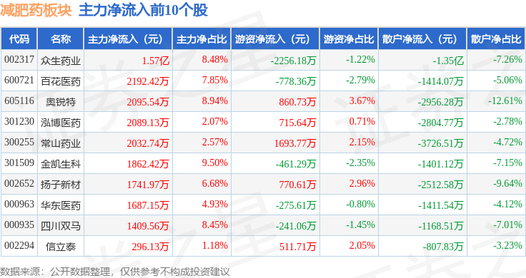 从资金流向上来看,当日减肥药板块主力资金净流出5.02亿元,游资资金净流出1.19亿元,散户资金净流入6.21亿元。减肥药板块个股资金流向见下表: