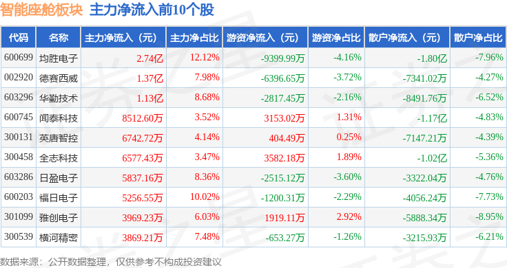 从资金流向上来看,当日智能座舱板块主力资金净流出12.57亿元,游资资金净流入2.09亿元,散户资金净流入10.48亿元。智能座舱板块个股资金流向见下表: