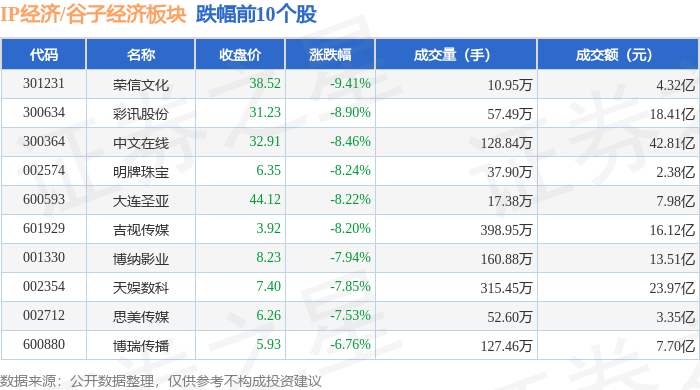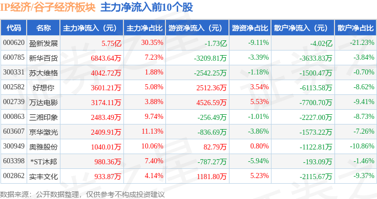 从资金流向上来看,当日IP经济/谷子经济板块主力资金净流出44.53亿元,游资资金净流入9.58亿元,散户资金净流入34.95亿元。IP经济/谷子经济板块个股资金流向见下表: