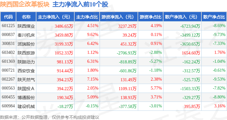 从资金流向上来看,当日陕西国企改革板块主力资金净流出5.22亿元,游资资金净流入2.36亿元,散户资金净流入2.86亿元。陕西国企改革板块个股资金流向见下表: