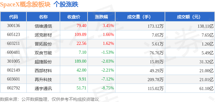 证券之星消息,1月16日SpaceX概念股板块较上一交易日下跌0.7%,通宇通讯领跌。当日上证指数报收于4101.91,下跌0.26%。深证成指报收于14281.08,下跌0.18%。SpaceX概念股板块个股涨跌见下表: