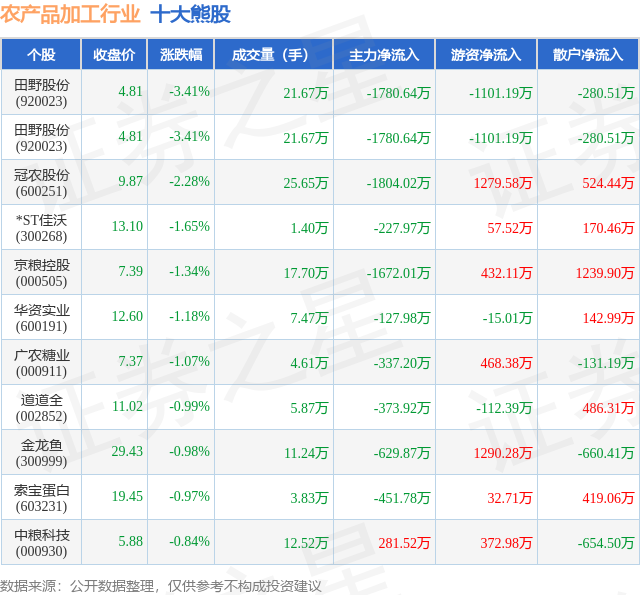个股表现方面,农产品加工行业当日领跌股为田野股份(920023),该股当日报收4.81,下跌3.41%,成交量21.67万,主力资金净流出1780.64万元。田野股份(920023)以下跌3.41%紧随其后,该股当日成交量21.67万,主力资金净流出1780.64万元。除此之外,冠农股份(600251)、*ST佳沃(300268)、京粮控股(000505)均进入当日熊股之列。具体个股列表见下表: