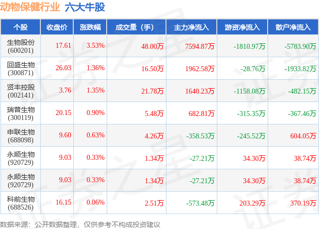 个股表现方面,动物保健行业当日领涨股为生物股份(600201),该股当日报收17.61,上涨3.53%,成交量48.0万,主力资金净流入7594.87万元。回盛生物(300871)以上涨1.36%紧随其后,该股当日成交量16.5万,主力资金净流入1962.58万元。除此之外,贤丰控股(002141)、瑞普生物(300119)、申联生物(688098)均进入当日牛股之列。具体个股列表见下表: