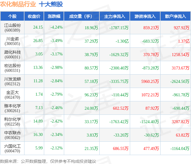 个股表现方面,农化制品行业当日领跌股为江山股份(600389),该股当日报收24.15,下跌4.24%,成交量18.96万,主力资金净流出1787.15万元。川金诺(300505)以下跌3.49%紧随其后,该股当日成交量37.29万,主力资金净流出1.3亿元。除此之外,潞化科技(600691)、宏达股份(600331)、川发龙蟒(002312)均进入当日熊股之列。具体个股列表见下表: