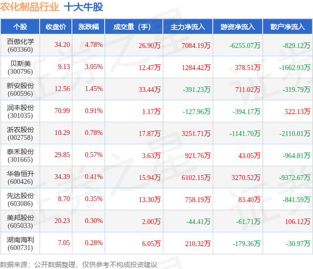 个股表现方面,农化制品行业当日领涨股为百傲化学(603360),该股当日报收34.2,上涨4.78%,成交量26.9万,主力资金净流入7084.19万元。贝斯美(300796)以上涨3.05%紧随其后,该股当日成交量12.47万,主力资金净流入1284.42万元。除此之外,新安股份(600596)、润丰股份(301035)、浙农股份(002758)均进入当日牛股之列。具体个股列表见下表: