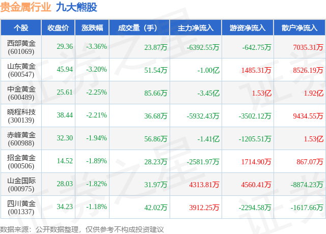 个股表现方面,贵金属行业当日领跌股为西部黄金(601069),该股当日报收29.36,下跌3.36%,成交量23.87万,主力资金净流出6392.55万元。山东黄金(600547)以下跌3.2%紧随其后,该股当日成交量51.54万,主力资金净流出1.0亿元。除此之外,中金黄金(600489)、晓程科技(300139)、赤峰黄金(600988)均进入当日熊股之列。具体个股列表见下表: