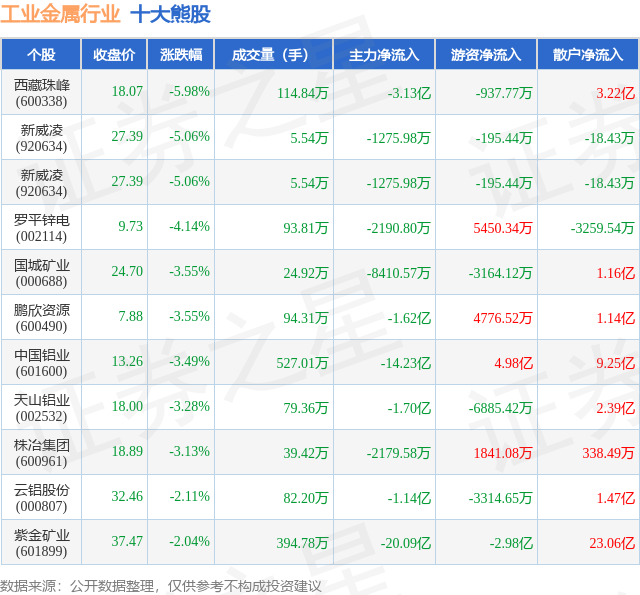 个股表现方面,工业金属行业当日领跌股为西藏珠峰(600338),该股当日报收18.07,下跌5.98%,成交量114.84万,主力资金净流出3.13亿元。新威凌(920634)以下跌5.06%紧随其后,该股当日成交量5.54万,主力资金净流出1275.98万元。除此之外,新威凌(920634)、罗平锌电(002114)、国城矿业(000688)均进入当日熊股之列。具体个股列表见下表: