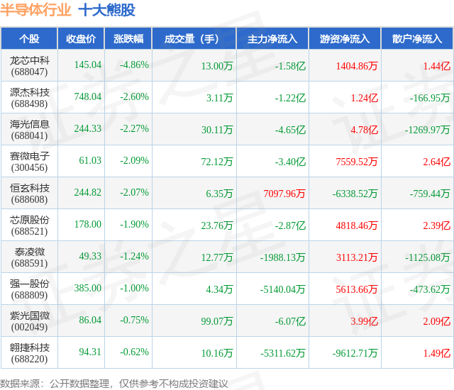 个股表现方面,半导体行业当日领跌股为龙芯中科(688047),该股当日报收145.04,下跌4.86%,成交量13.0万,主力资金净流出1.58亿元。源杰科技(688498)以下跌2.6%紧随其后,该股当日成交量3.11万,主力资金净流出1.22亿元。除此之外,海光信息(688041)、赛微电子(300456)、恒玄科技(688608)均进入当日熊股之列。具体个股列表见下表: