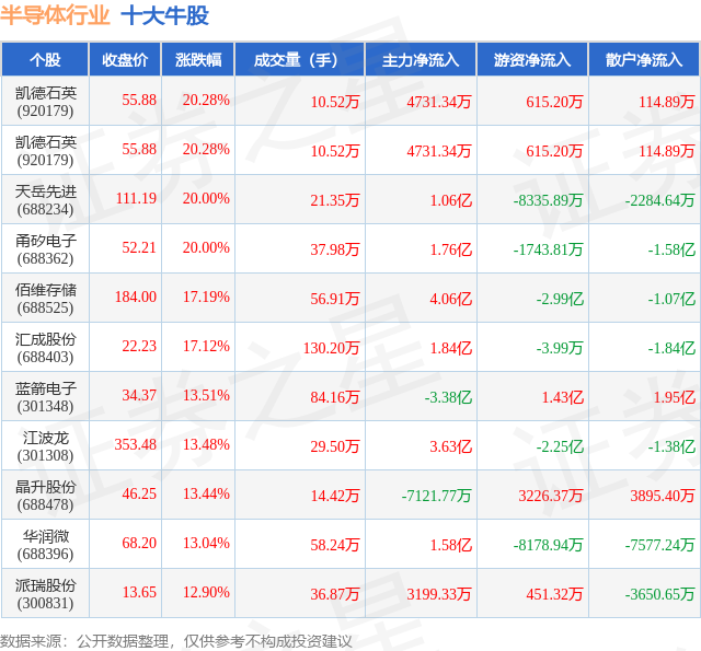 个股表现方面,半导体行业当日领涨股为凯德石英(920179),该股当日报收55.88,上涨20.28%,成交量10.52万,主力资金净流入4731.34万元。凯德石英(920179)以上涨20.28%紧随其后,该股当日成交量10.52万,主力资金净流入4731.34万元。除此之外,天岳先进(688234)、甬矽电子(688362)、佰维存储(688525)均进入当日牛股之列。具体个股列表见下表: