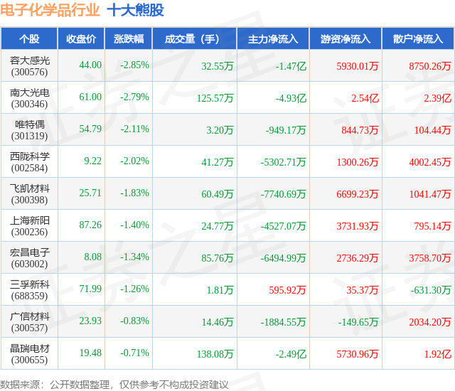 个股表现方面,电子化学品行业当日领跌股为容大感光(300576),该股当日报收44.0,下跌2.85%,成交量32.55万,主力资金净流出1.47亿元。南大光电(300346)以下跌2.79%紧随其后,该股当日成交量125.57万,主力资金净流出4.93亿元。除此之外,唯特偶(301319)、西陇科学(002584)、飞凯材料(300398)均进入当日熊股之列。具体个股列表见下表: