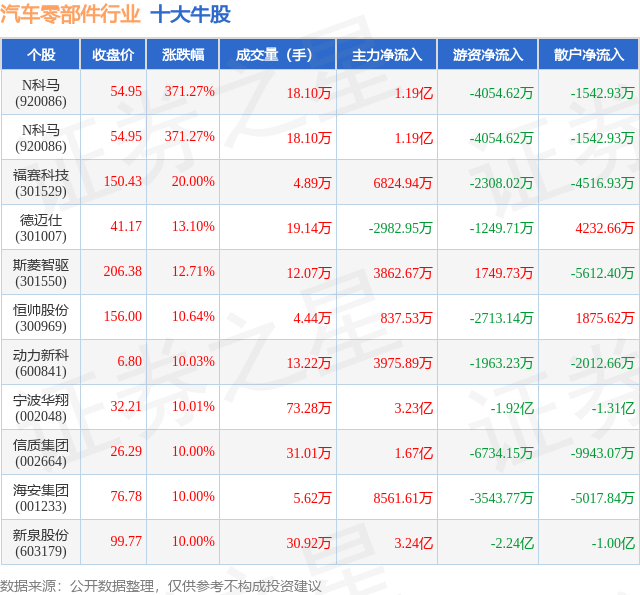 个股表现方面,汽车零部件行业当日领涨股为N科马(920086),该股当日报收54.95,上涨371.27%,成交量18.1万,主力资金净流入1.19亿元。N科马(920086)以上涨371.27%紧随其后,该股当日成交量18.1万,主力资金净流入1.19亿元。除此之外,福赛科技(301529)、德迈仕(301007)、斯菱智驱(301550)均进入当日牛股之列。具体个股列表见下表: