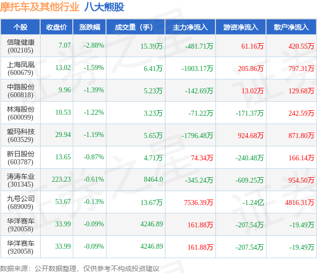 个股表现方面,摩托车及其他行业当日领跌股为信隆健康(002105),该股当日报收7.07,下跌2.88%,成交量15.39万,主力资金净流出481.71万元。上海凤凰(600679)以下跌1.59%紧随其后,该股当日成交量6.41万,主力资金净流出1003.17万元。除此之外,中路股份(600818)、林海股份(600099)、爱玛科技(603529)均进入当日熊股之列。具体个股列表见下表: