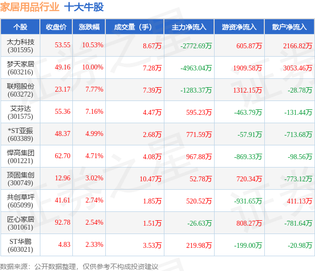 个股表现方面,家居用品行业当日领涨股为太力科技(301595),该股当日报收53.55,上涨10.53%,成交量8.67万,主力资金净流出2772.69万元。梦天家居(603216)以上涨10.0%紧随其后,该股当日成交量7.28万,主力资金净流出4963.04万元。除此之外,联翔股份(603272)、艾芬达(301575)、*ST亚振(603389)均进入当日牛股之列。具体个股列表见下表:
