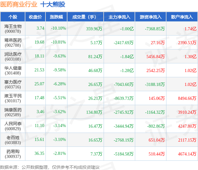 个股表现方面,医药商业行业当日领跌股为海王生物(000078),该股当日报收3.74,下跌10.1%,成交量359.96万,主力资金净流出1.0亿元。鹭燕医药(002788)以下跌10.01%紧随其后,该股当日成交量5.17万,主力资金净流出2417.69万元。除此之外,润达医疗(603108)、华人健康(301408)、塞力医疗(603716)均进入当日熊股之列。具体个股列表见下表: