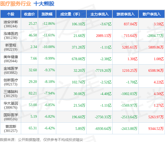 个股表现方面,医疗服务行业当日领跌股为迪安诊断(300244),该股当日报收25.27,下跌12.86%,成交量106.1万,主力资金净流出3.67亿元。泓博医药(301230)以下跌11.61%紧随其后,该股当日成交量21.68万,主力资金净流入2089.13万元。除此之外,新里程(002219)、美年健康(002044)、金域医学(603882)均进入当日熊股之列。具体个股列表见下表: