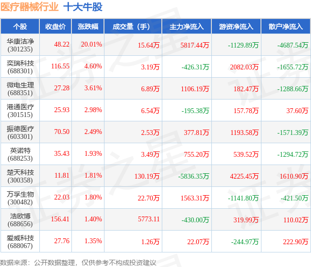 个股表现方面,医疗器械行业当日领涨股为华康洁净(301235),该股当日报收48.22,上涨20.01%,成交量15.64万,主力资金净流入5817.44万元。奕瑞科技(688301)以上涨4.6%紧随其后,该股当日成交量3.19万,主力资金净流出426.31万元。除此之外,微电生理(688351)、港通医疗(301515)、振德医疗(603301)均进入当日牛股之列。具体个股列表见下表: