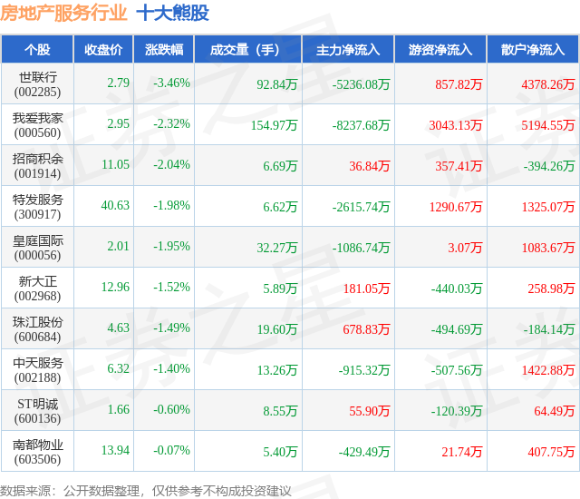 个股表现方面,房地产服务行业当日领跌股为世联行(002285),该股当日报收2.79,下跌3.46%,成交量92.84万,主力资金净流出5236.08万元。我爱我家(000560)以下跌2.32%紧随其后,该股当日成交量154.97万,主力资金净流出8237.68万元。除此之外,招商积余(001914)、特发服务(300917)、皇庭国际(000056)均进入当日熊股之列。具体个股列表见下表: