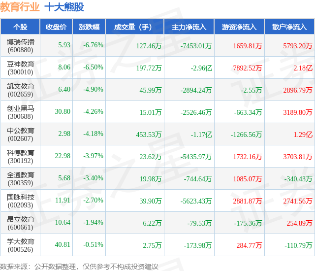 个股表现方面,教育行业当日领跌股为博瑞传播(600880),该股当日报收5.93,下跌6.76%,成交量127.46万,主力资金净流出7453.01万元。豆神教育(300010)以下跌6.5%紧随其后,该股当日成交量197.72万,主力资金净流出2.96亿元。除此之外,凯文教育(002659)、创业黑马(300688)、中公教育(002607)均进入当日熊股之列。具体个股列表见下表:
