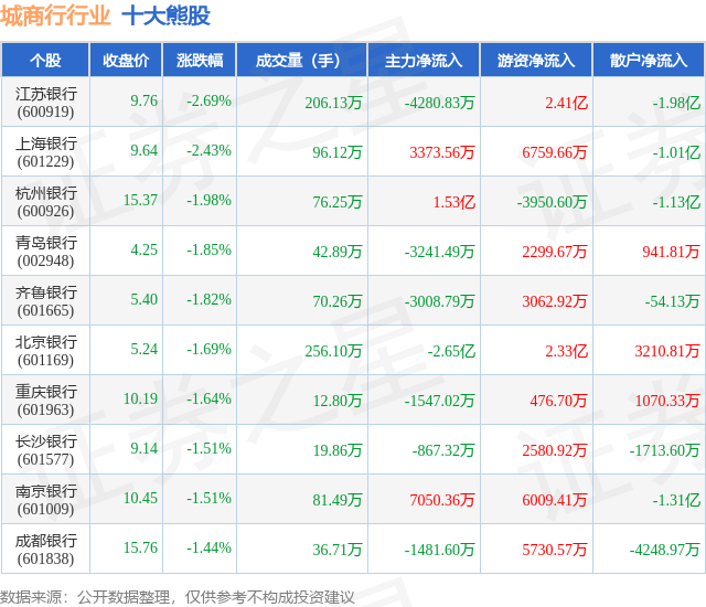 个股表现方面,城商行行业当日领跌股为江苏银行(600919),该股当日报收9.76,下跌2.69%,成交量206.13万,主力资金净流出4280.83万元。上海银行(601229)以下跌2.43%紧随其后,该股当日成交量96.12万,主力资金净流入3373.56万元。除此之外,杭州银行(600926)、青岛银行(002948)、齐鲁银行(601665)均进入当日熊股之列。具体个股列表见下表: