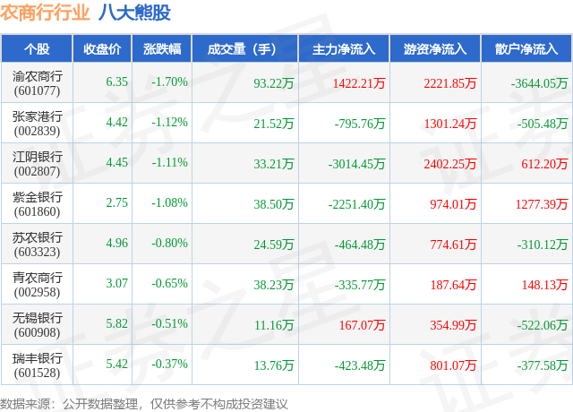 个股表现方面,农商行行业当日领跌股为渝农商行(601077),该股当日报收6.35,下跌1.7%,成交量93.22万,主力资金净流入1422.21万元。张家港行(002839)以下跌1.12%紧随其后,该股当日成交量21.52万,主力资金净流出795.76万元。除此之外,江阴银行(002807)、紫金银行(601860)、苏农银行(603323)均进入当日熊股之列。具体个股列表见下表: