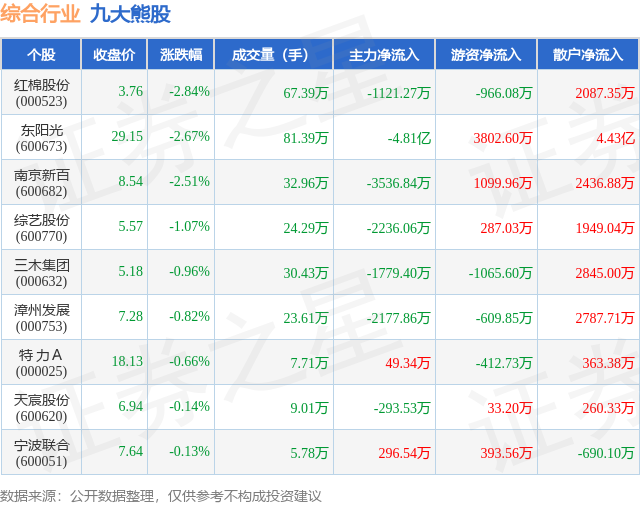 个股表现方面,综合行业当日领跌股为红棉股份(000523),该股当日报收3.76,下跌2.84%,成交量67.39万,主力资金净流出1121.27万元。东阳光(600673)以下跌2.67%紧随其后,该股当日成交量81.39万,主力资金净流出4.81亿元。除此之外,南京新百(600682)、综艺股份(600770)、三木集团(000632)均进入当日熊股之列。具体个股列表见下表: