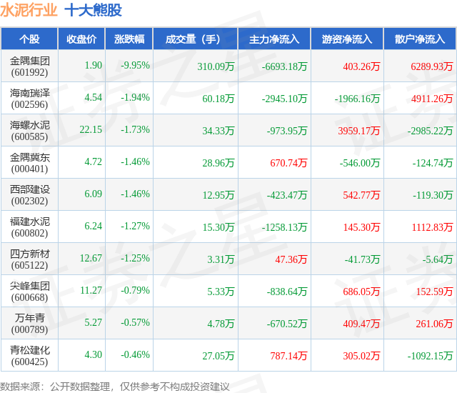 个股表现方面,水泥行业当日领跌股为金隅集团(601992),该股当日报收1.9,下跌9.95%,成交量310.09万,主力资金净流出6693.18万元。海南瑞泽(002596)以下跌1.94%紧随其后,该股当日成交量60.18万,主力资金净流出2945.1万元。除此之外,海螺水泥(600585)、金隅冀东(000401)、西部建设(002302)均进入当日熊股之列。具体个股列表见下表: