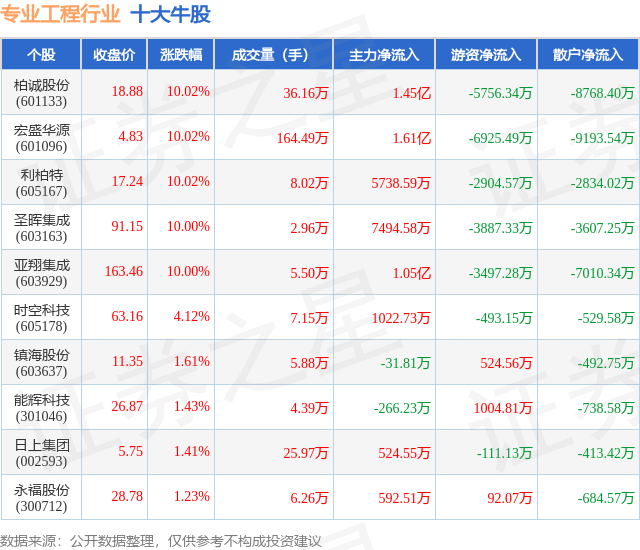 个股表现方面,专业工程行业当日领涨股为柏诚股份(601133),该股当日报收18.88,上涨10.02%,成交量36.16万,主力资金净流入1.45亿元。宏盛华源(601096)以上涨10.02%紧随其后,该股当日成交量164.49万,主力资金净流入1.61亿元。除此之外,利柏特(605167)、圣晖集成(603163)、亚翔集成(603929)均进入当日牛股之列。具体个股列表见下表: