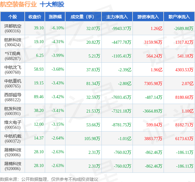 个股表现方面,航空装备行业当日领跌股为洪都航空(600316),该股当日报收39.1,下跌6.1%,成交量32.07万,主力资金净流出9943.37万元。航新科技(300424)以下跌4.31%紧随其后,该股当日成交量20.82万,主力资金净流出4477.78万元。除此之外,*ST观典(688287)、中航沈飞(600760)、中航重机(600765)均进入当日熊股之列。具体个股列表见下表: