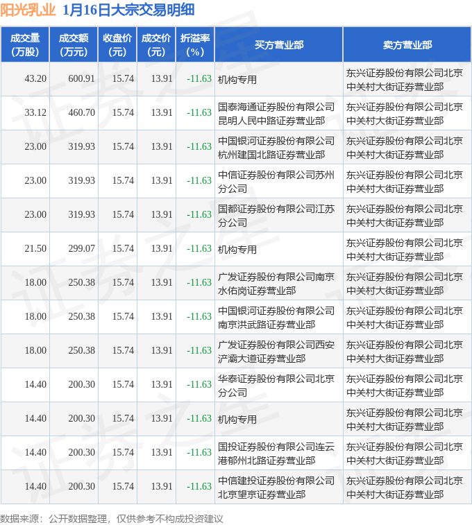 证券之星消息,1月16日阳光乳业发生大宗交易,交易数据如下: