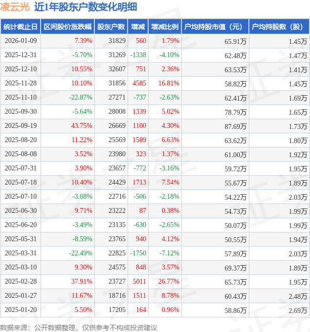 证券之星消息,近日凌云光披露,截至2026年1月9日公司股东户数为3.18万户,较12月31日增加560.0户,增幅为1.79%。户均持股数量由上期的1.47万股减少至1.45万股,户均持股市值为65.91万元。
