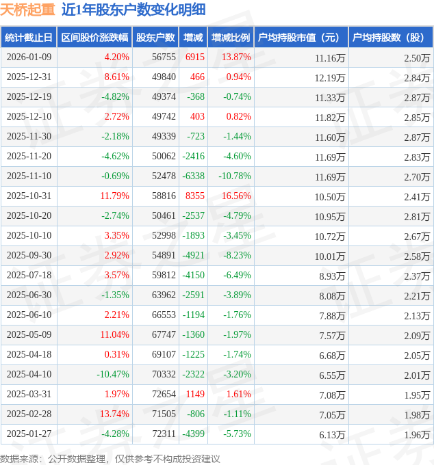 从股价来看,2025年12月31日至2026年1月9日,天桥起重区间涨幅为4.2%,在此期间股东户数增加6915.0户,增幅为13.87%。