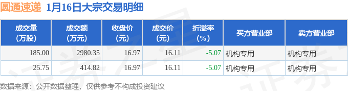 证券之星消息,1月16日圆通速递发生大宗交易,交易数据如下: