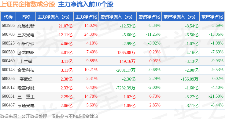 资金流向方面,上证民企(000049)指数成份股当日主力资金净流入合计11.15亿元,游资资金净流出合计9.17亿元,散户资金净流出合计1.98亿元。成份股资金流向详情见下表: