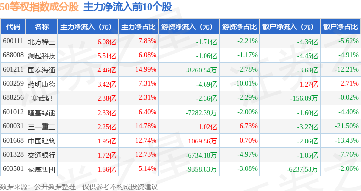 资金流向方面,50等权(000050)指数成份股当日主力资金净流出合计50.45亿元,游资资金净流入合计2.92亿元,散户资金净流入合计47.53亿元。成份股资金流向详情见下表: