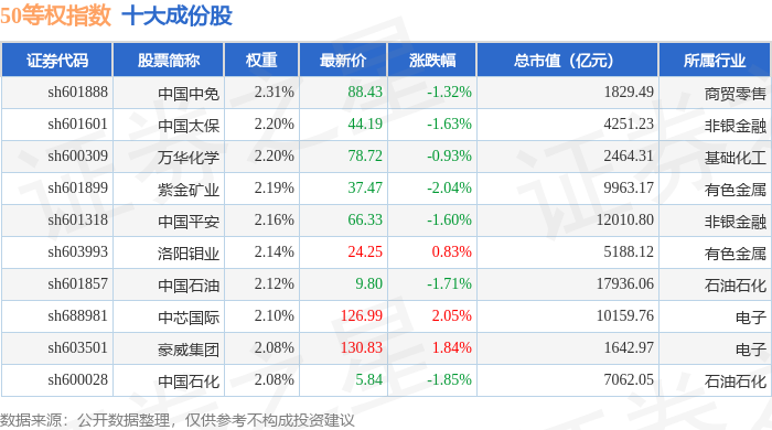 50等权(000050)指数十大成份股详情如下: