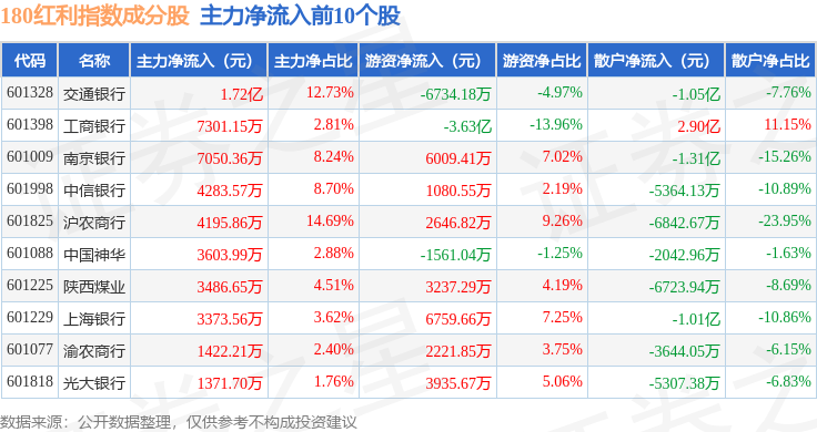 资金流向方面,180红利(000149)指数成份股当日主力资金净流出合计14.17亿元,游资资金净流出合计3.52亿元,散户资金净流入合计17.69亿元。成份股资金流向详情见下表: