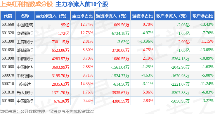 资金流向方面,上央红利(000152)指数成份股当日主力资金净流出合计10.79亿元,游资资金净流入合计2756.5万元,散户资金净流入合计10.51亿元。成份股资金流向详情见下表: