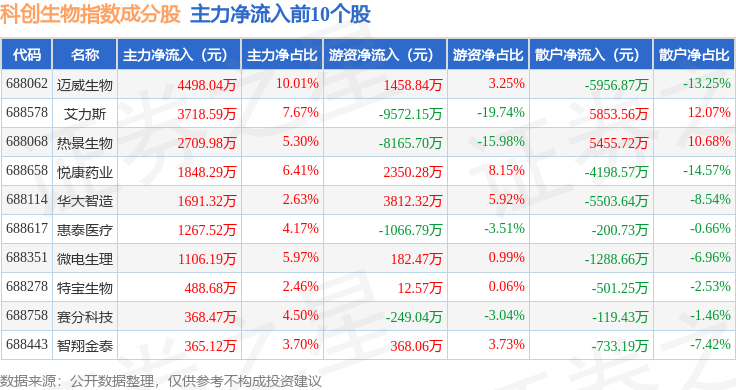 资金流向方面,科创生物(000683)指数成份股当日主力资金净流出合计7.98亿元,游资资金净流入合计6568.85万元,散户资金净流入合计7.32亿元。成份股资金流向详情见下表: