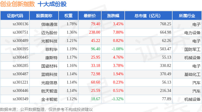 创业创新(399018)指数十大成份股详情如下:
