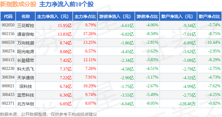 资金流向方面,新指数(399100)成份股当日主力资金净流出合计316.79亿元,游资资金净流入合计24.27亿元,散户资金净流入合计292.52亿元。成份股资金流向详情见下表: