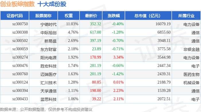 创业板综(399102)指数十大成份股详情如下: