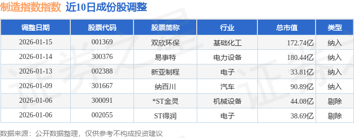 近10日内制造指数(399233)成份股做了调整,新纳入了4只股票,剔除了2只股票。