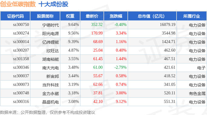 证券之星消息,1月16日,创业低碳(399259)指数报收于5091.91点,涨0.89%,成交749.94亿元,换手率4.11%。当日该指数成份股中,上涨的有29家,晶盛机电以9.12%的涨幅领涨,下跌的有19家,鹏辉能源以4.09%的跌幅领跌。